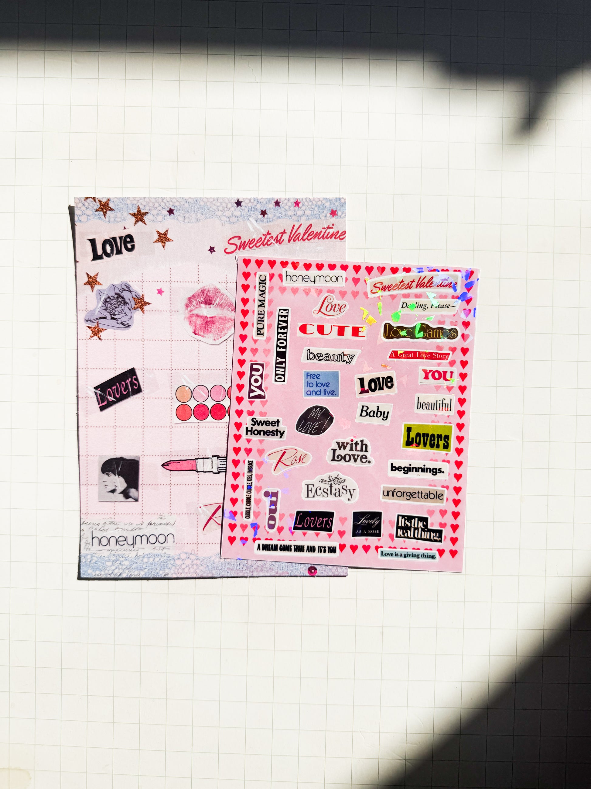 Sourced from vintage magazines, each word is hand-cut, scanned, and transformed into stickers that feel nostalgic, playful, and timeless. Inspired by romantic headlines, sweet phrases, and cut-out words pulled from old paper love stories.